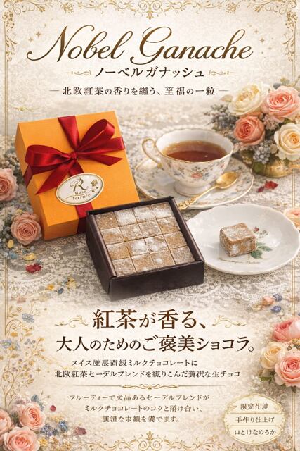 スイス産の最高級ミルクチョコレートに、スウェーデン王室御用達の北欧紅茶「セーデルブレンド」を練りこんだ、とても贅沢な生チョコです。